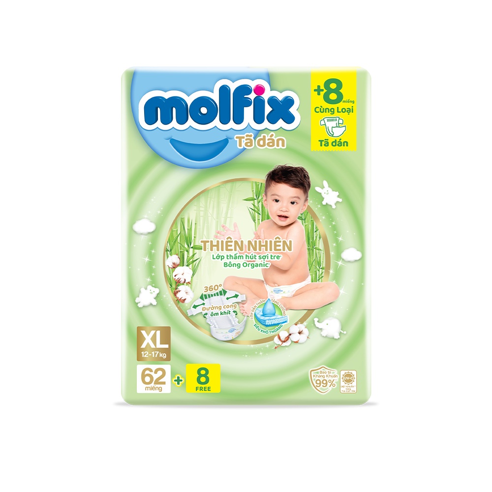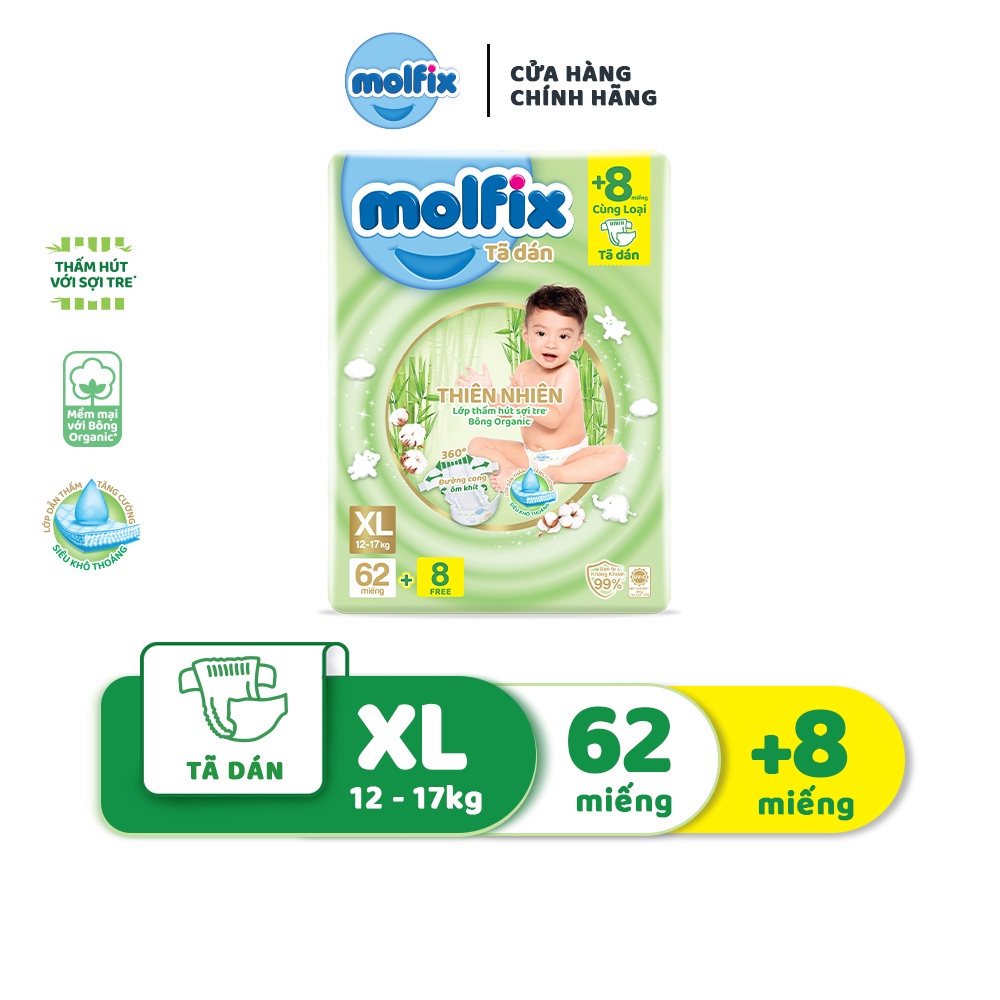 Tã/bỉm dán Molfix Thiên nhiên Super Jumbo XL (12kg – 17kg) – Gói 62+8 miếng