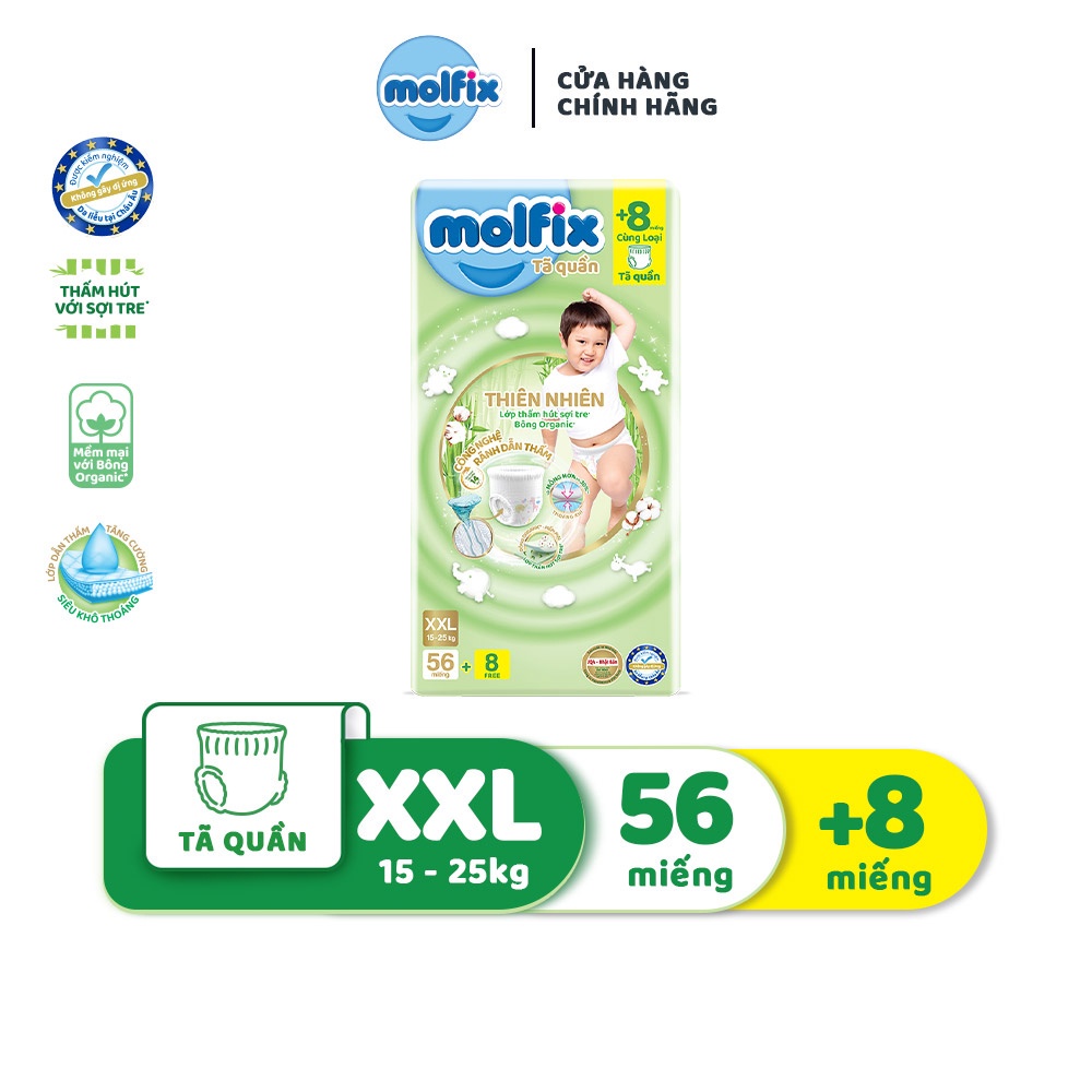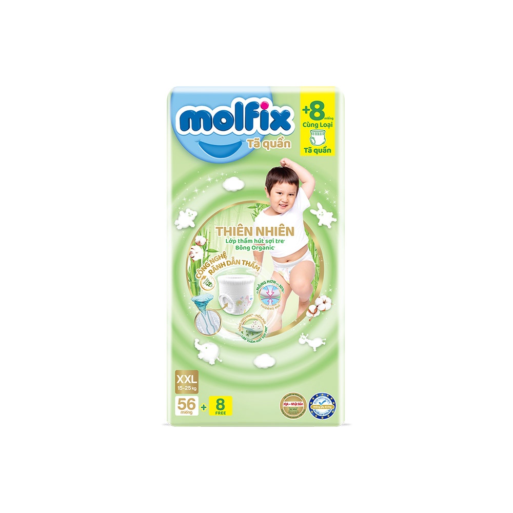 Tã/bỉm quần Molfix Thiên nhiên Ultra XXL (15kg – 25kg) – Gói 56+8 miếng