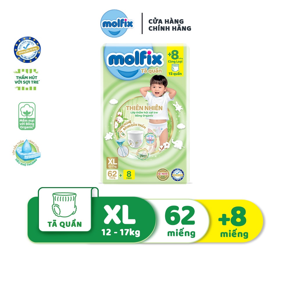 Tã/bỉm quần Molfix Thiên nhiên Ultra XL (12kg – 17kg) – Gói 62+8 miếng